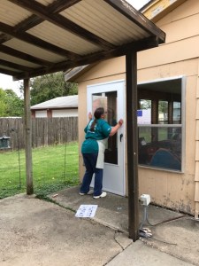 Volunteers then scraped lead paint from the home exterior and applied a fresh coat of paint to the walls in the kitchen and hallway. The 1954 home needed storm doors, not only for warmth but for security. The team also noticed that the front deck railing was loose and unsafe, and several windows were missing screens and/or glass.