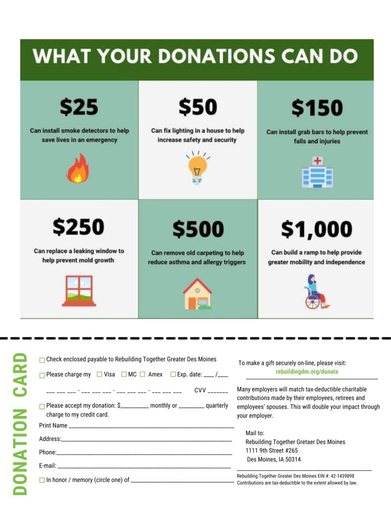 To donate by check, print off the form above and mail to our office: Rebuilding Together, 1111 9th Street #265, Des Moines, IA 50314